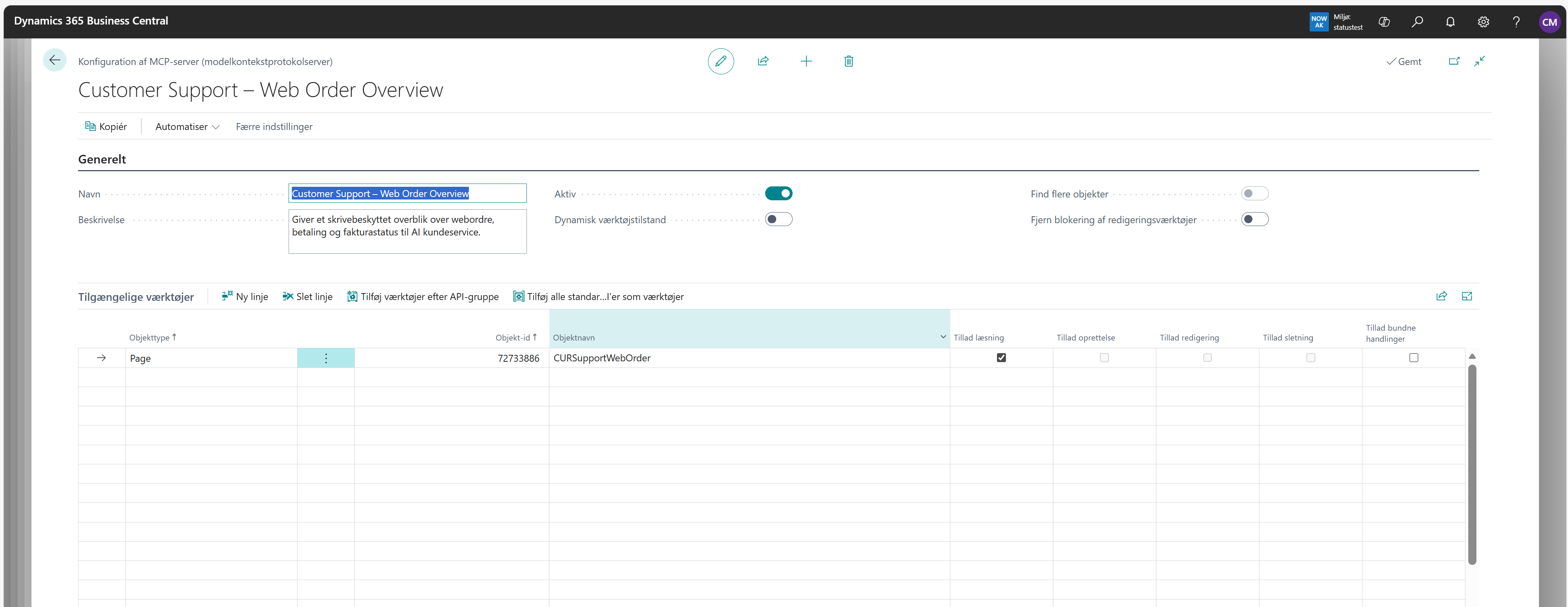 Funktionen skal aktiveres i Business Central, og adgangen konfigureres bevidst. Man vælger præcist, hvilke oplysninger der må stilles spørgsmål til, og i hvilken form svarene gives. Det giver fuld kontrol og gør det muligt at starte i det små, for eksempel med ordre- og betalingsstatus til kundeservice.