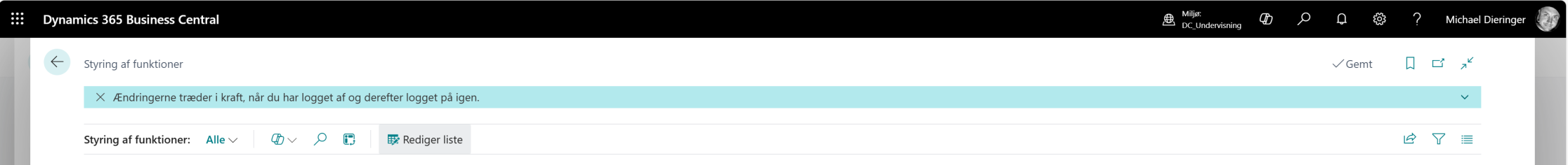 Når du har aktiveret funktionen, vil Business Central gøre opmærksom på, at ændringen først træder i kraft, efter du har logget af og på igen: