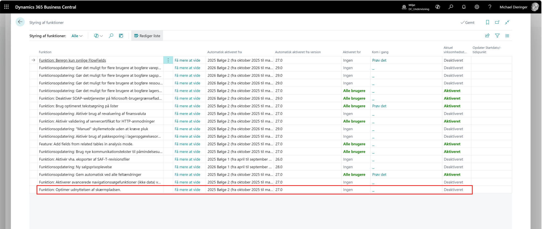 I Business Central 2025 wave 1 har Microsoft introduceret en ny funktion, der gør det muligt at udnytte skærmen bedre. Funktionen hedder "Optimer udnyttelsen af skærmpladsen" – og som bruger skal du selv aktivere den.