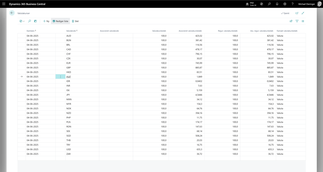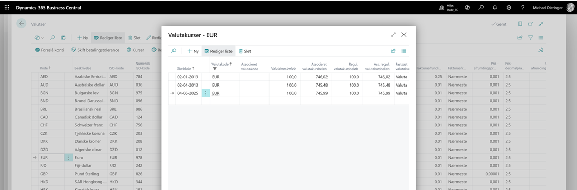 Hvis kørslen udføres uden fejl, kan du navigere til oversigten for valuta og derfra se om der er kommet nye valutakurser for i dag. Jeg tester her for valutakode EUR og kan se at valutakursen er opdateret pr. den 4. juni 2025, hvilket var dagen for udførelsen og aktiveringen af kørslen.