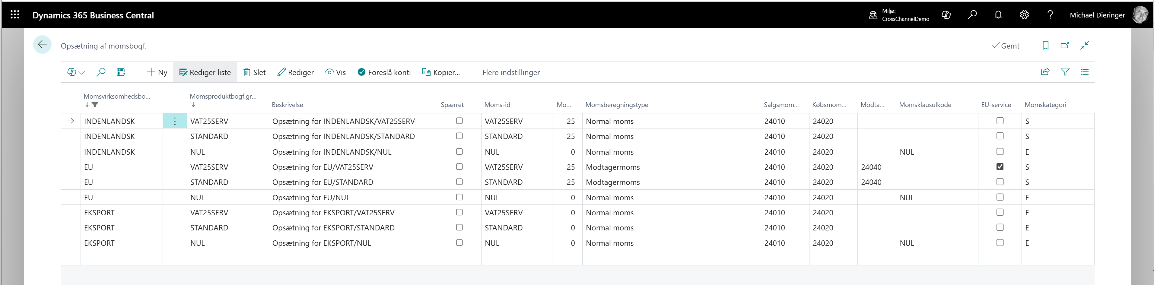 Når disse to mødes, lander vi nederst i Moms-bogføringsopsætningen. Det er her, Business Central beslutter hvordan momsen skal beregnes, hvilken sats der bruges, og hvordan den bogføres og rapporteres i regnskabet.