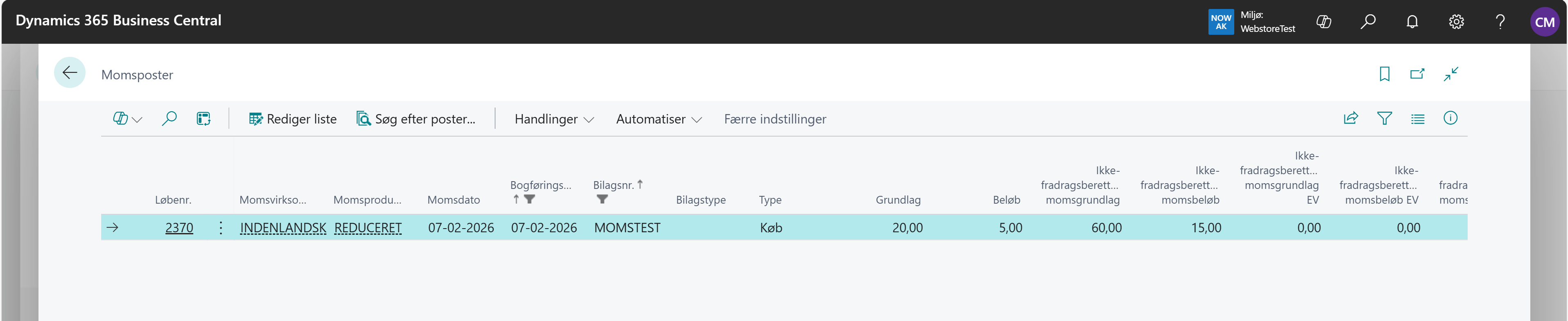 Det betyder, at den ikke-fradragsberettigede del bogføres som en omkostning, mens den fradragsberettigede del indgår i momsafregningen. Der er således ikke behov for manuelle splits, særskilte posteringer eller efterfølgende korrektioner. Alt håndteres inden for standardfunktionaliteten i Business Central.