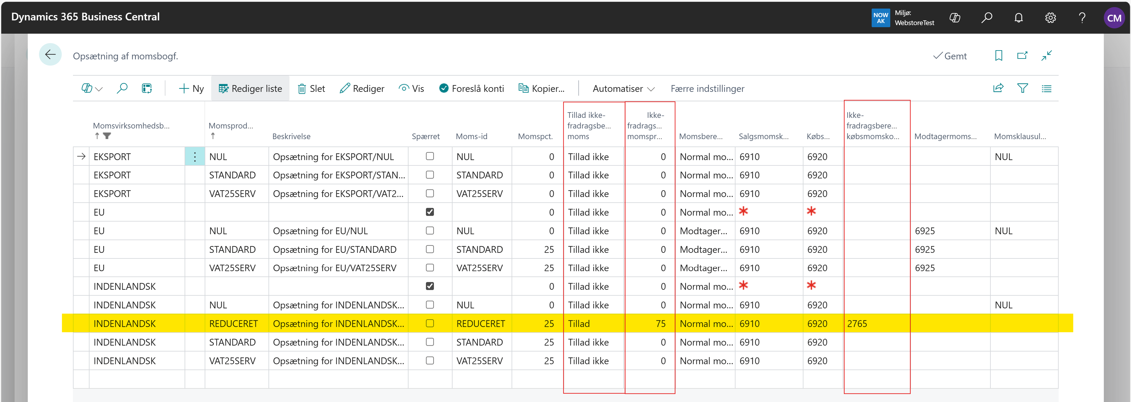 Billedet ovenfor viser momsbogføringsopsætningen i Business Central, hvor de relevante felter er markeret med en rød ramme. Den gule linje markerer den opsætning, der anvendes til kvartmomstræk (repræsentationsudgifter).